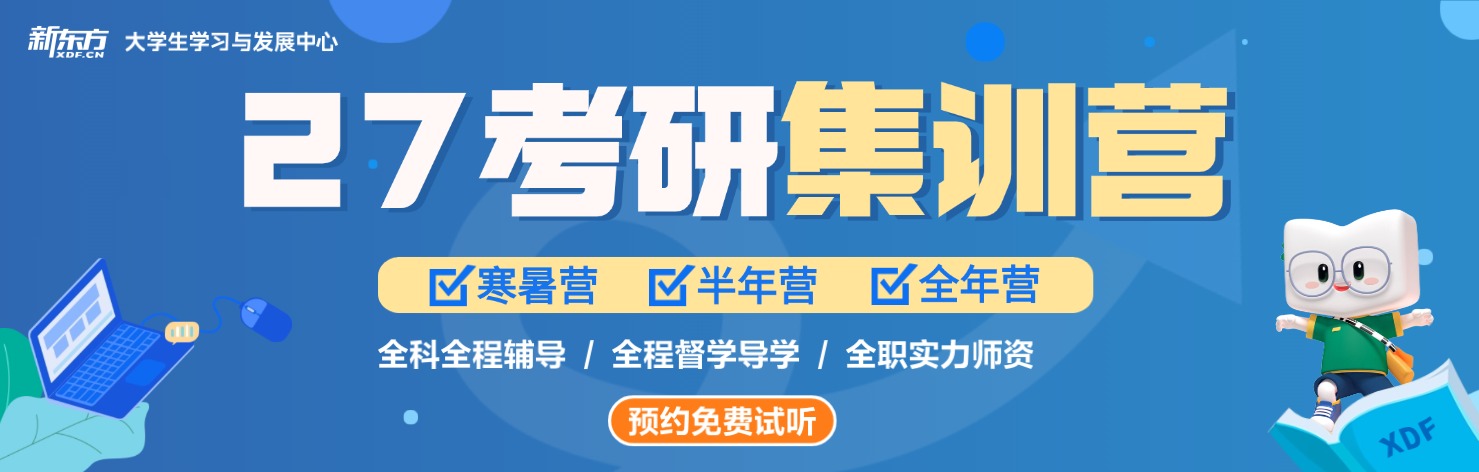 新东方考研集训营提供全年备考指导,包含寒暑假集训营、半年集训营、全年集训营、分阶段复习(基础、巩固、冲刺),教学采用“讲练测评考”五步闭环:精讲考点→课后练习→周测/月测→个性化评讲→全真模考